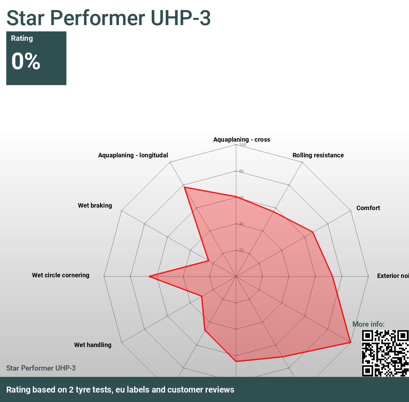 тази графика показва как гумата се нарежда по различни характеристики в сравнение с други тествани гуми. по-висок процентил означава по-добра производителност - 100% означава по-добра от всяка гума във всеки тест, 0% означава по-лоша от всяка гума във всеки тест.